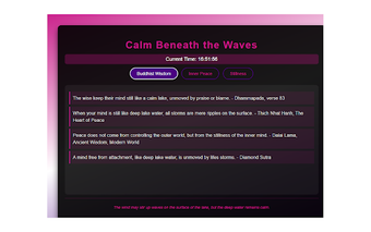 Calm Beneath the Waves to darmowe rozszerzenie do przeglądarki Chrome, które oferuje użytkownikom dostęp do 100 inspirujących cytatów dotyczących uważności. Cytaty te są podzielone na dwie kategorie: Mądrość Buddyjską oraz Kreatywne Refleksje na temat Wewnętrznego Spokoju. Dzięki temu rozszerzeniu użytkownicy mogą w prosty sposób wzbogacić swoje przemyślenia o wartościowe myśli, które mogą wspierać ich codzienną praktykę mindfulness.
